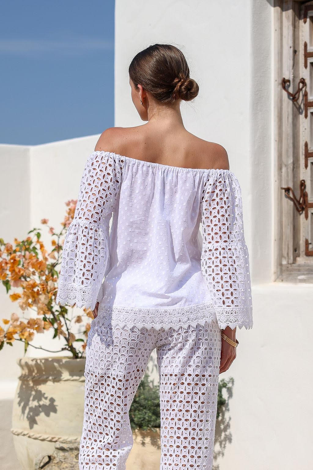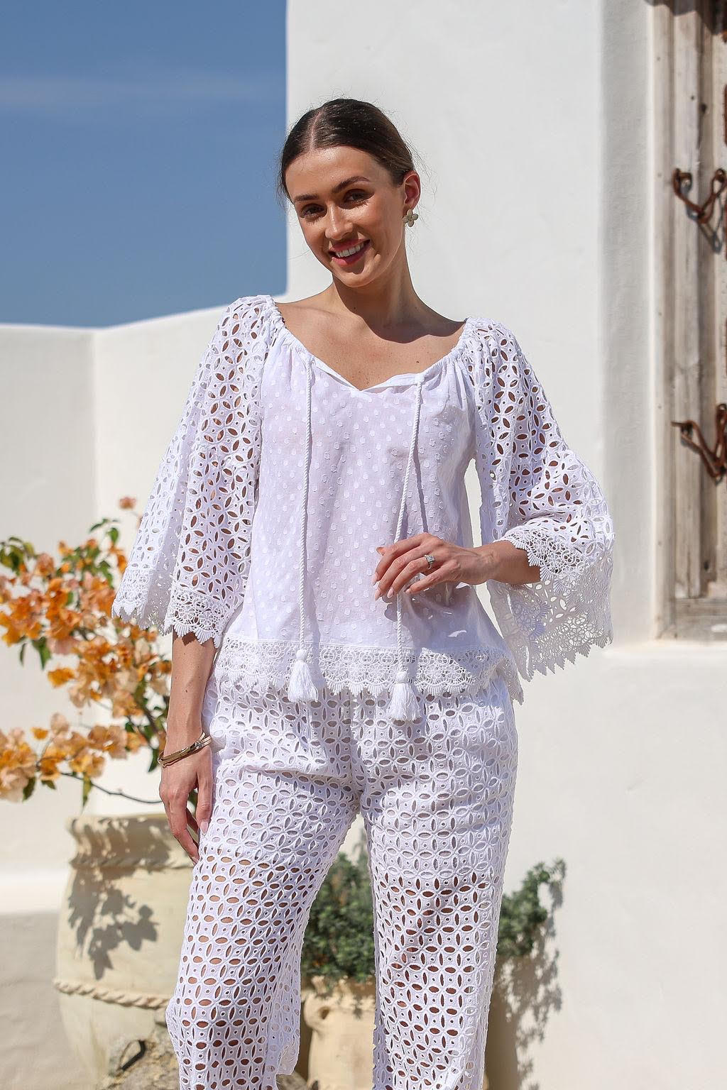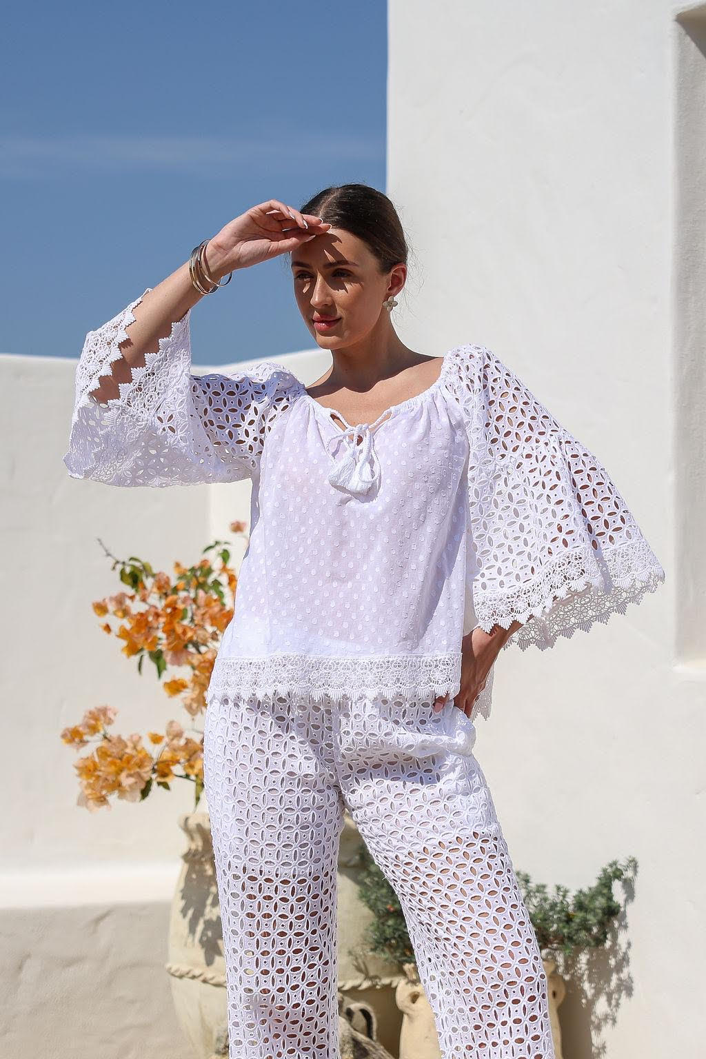 The Elise Top is a fun and versatile piece with detailed embroidery on the sleeves that adds a touch of charm. Its drawstring lets you adjust the fit perfectly, while the playful design can be worn off the shoulder for a flirty look or pulled up for a more classic vibe. Perfect for switching up your style with ease!